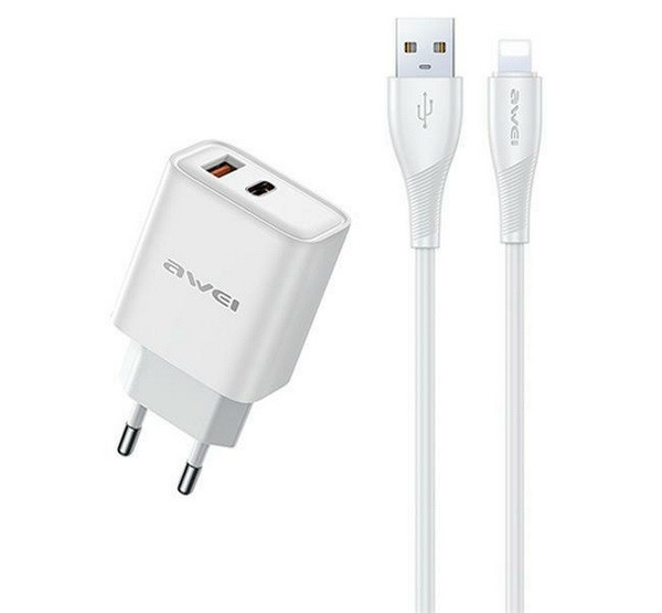 AWEI PD81L-EU hálózati töltő USB+Type-C aljzat (22.5W, GaN, PD gyorstöltő + lightning kábel) FEHÉR