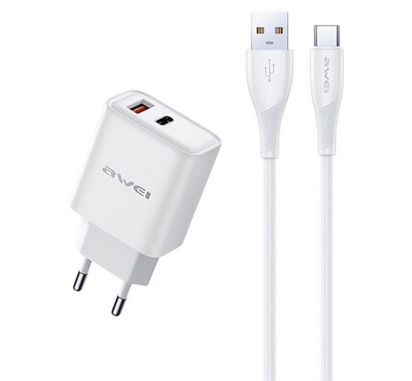 AWEI PD81T-EU hálózati töltő USB+Type-C aljzat (22.5W, GaN, PD gyorstöltő + Type-C kábel) FEHÉR