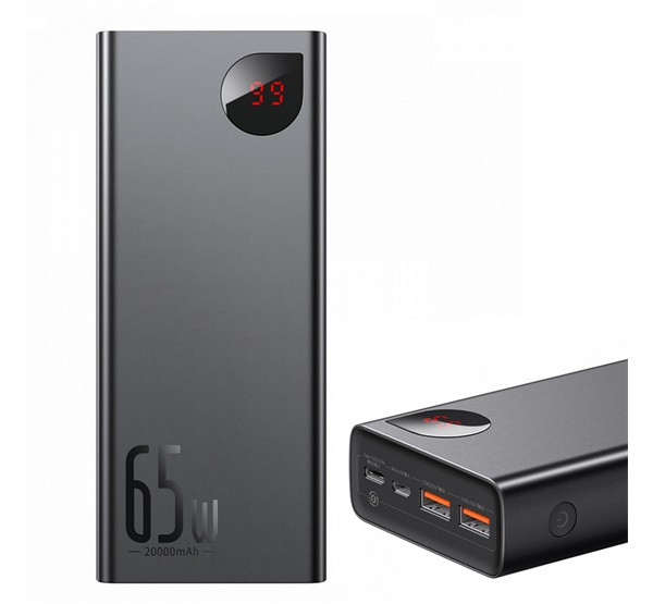 BASEUS ADAMAN vésztöltő 2 USB+Type-C aljzat (20000mAh, 65W, PD gyorstöltő 3.0, LED kijelző) FEKETE
