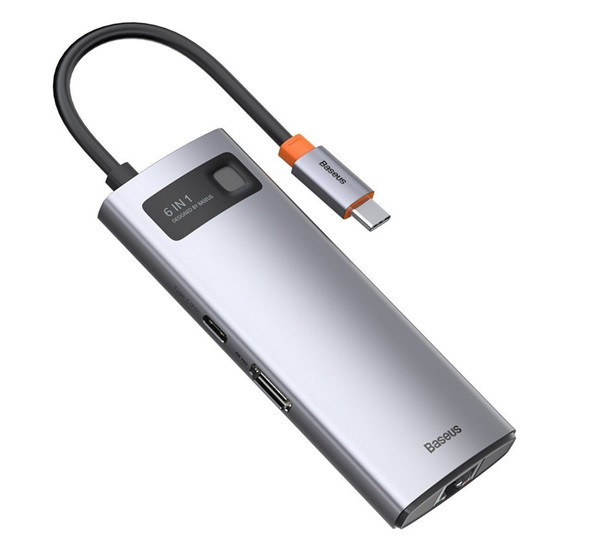 BASEUS Type-C HUB 6in1 (aktív, elosztó, HDMI+3 USB+Type-C+RJ45 aljzat, PD gyorstöltő) SÖTÉTSZÜRKE