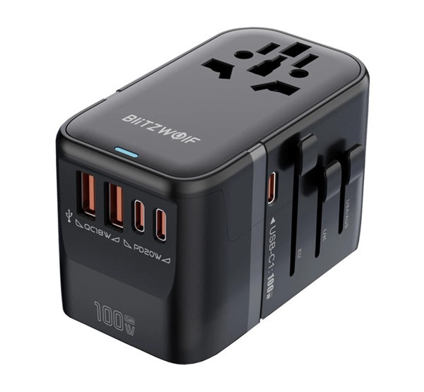 BLITZWOLF BW-TA2 utazó töltő 2 USB+3 Type-C aljzat (100W, GaN, PD gyorstöltés, EU, UK, US, AU) FEKETE
