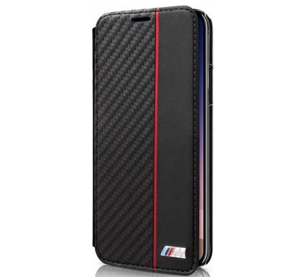 BMW műanyag telefonvédő (bőr hatású FLIP, átlátszó hátlap, oldalra nyíló, karbon minta) FEKETE