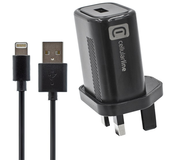 CELLULARLINE utazó töltő USB aljzat (12W, UK, földelt + lightning kábel) FEKETE