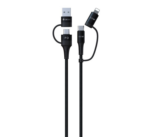DEVIA EXTREME adatkábel 4in1 (Type-C/USB - lightning/Type-C, 60W, PD gyorstöltő, cipőfűző, 150cm) FEKETE