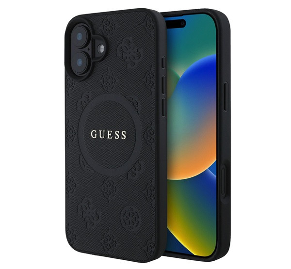 GUESS SAFFIANO PEONY CLASSIC LOGO szilikon telefonvédő (ütésállóság, bőr hatású hátlap, MagSafe) FEKETE