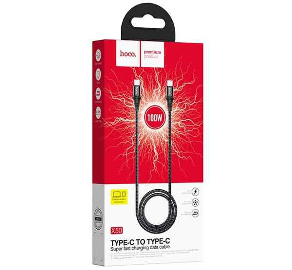 HOCO X50 adatkábel (Type-C - Type-C, PD gyorstöltő, törésgátló, cipőfűző, 200cm) FEKETE