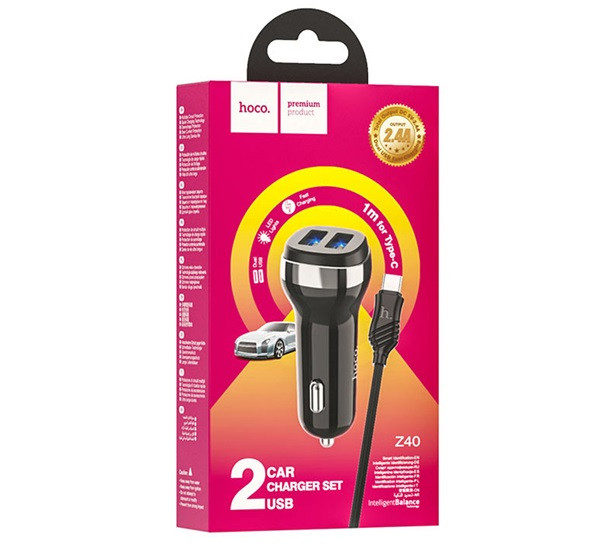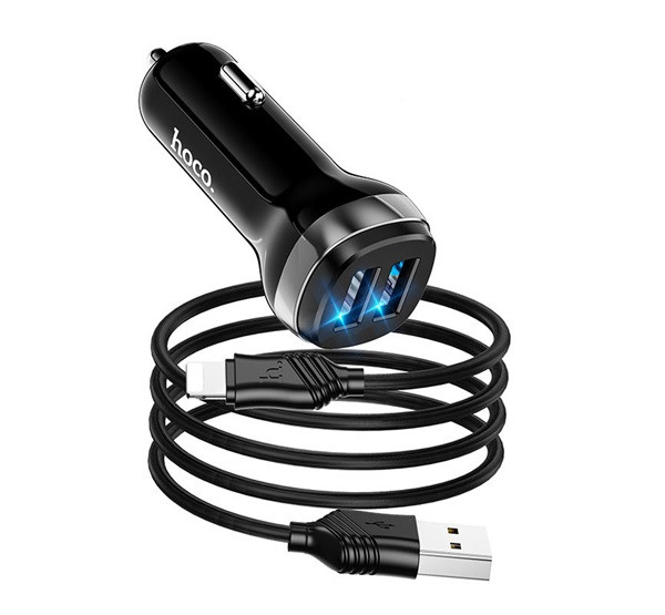 HOCO Z40 autós töltő 2 USB aljzat (12W, gyorstöltő, LED jelzés + lightning kábel) FEKETE