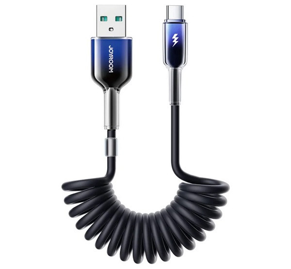 JOYROOM CRYSTAL-CLEAR adatkábel (USB - Type-C, 3A, gyorstöltő, spirálkábel, 150cm) FEKETE
