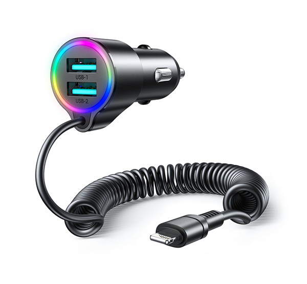 JOYROOM autós töltő 2 USB aljzat (17W, PD gyorstöltő 5.0 + fix lightning kábel) FEKETE
