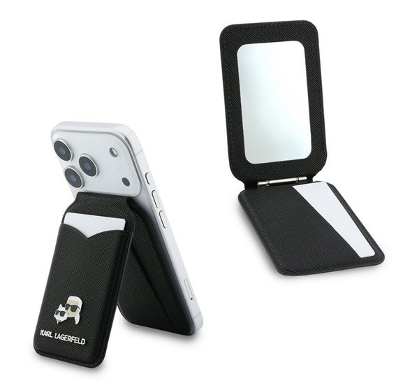 KARL LAGERFELD MIRROR tok, bőr hatású (univerzális, kártyatartó, kitámasztó, tükör, MagSafe) FEKETE