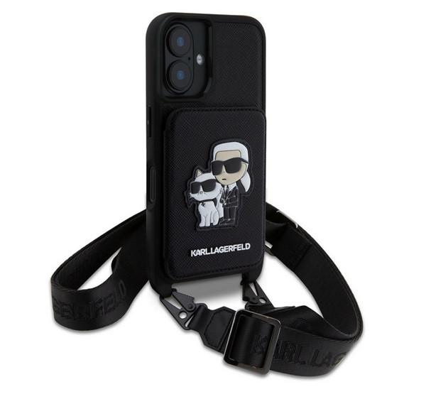 KARL LAGERFELD SAFFIANO CROSSBODY STRAP szilikon telefonvédő (ütésállóság, nyakpánt, kártyatartó) FEKETE