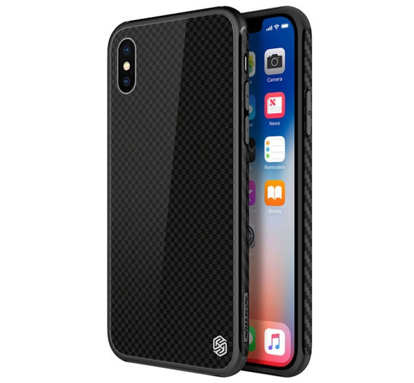 NILLKIN TEMPERED PLAID szilikon telefonvédő (ütésállóság, üveg hátlap, négyzet) FEKETE