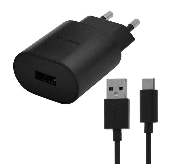 NOKIA hálózati töltő USB aljzat (18W, gyorstöltő + Type-C kábel) FEKETE