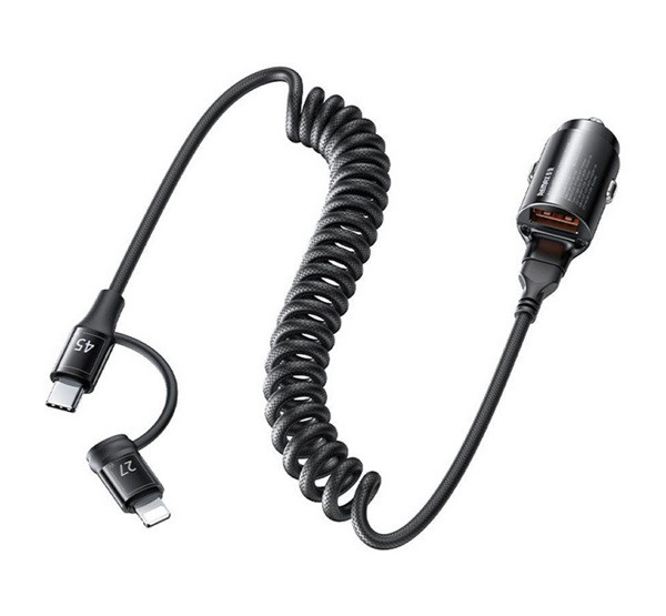 REMAX RUICHY autós töltő USB aljzat (45W, PD gyorstöltő + fix spirál Type-C - lightning kábel) FEKETE