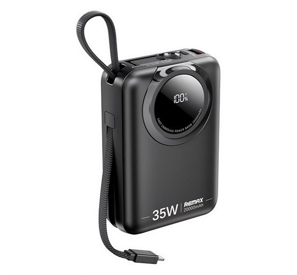 REMAX SCUBA vésztöltő Type-C+lightning aljzat (20000mAh, 35W, PD gyorstöltő, LED kijelző + fix Type-C kábel) FEKETE