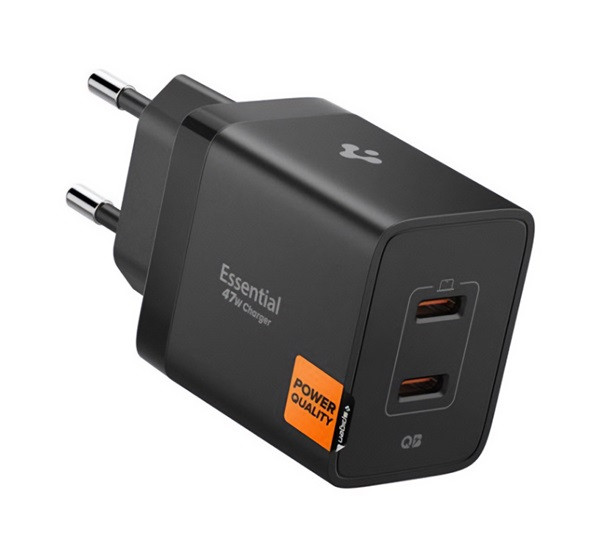 SPIGEN ESSENTIAL hálózati töltő 2 USB aljzat (47W, GaN, PD gyorstöltő 3.0) FEKETE