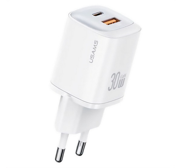 USAMS CC254 hálózati töltő USB+Type-C aljzat (30W, GaN, PD gyorstöltő) FEHÉR