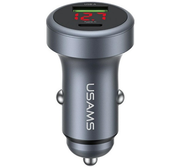 USAMS CC327 autós töltő USB+Type-C aljzat (45W, PD gyorstöltő, LED kijelző) SÖTÉTSZÜRKE