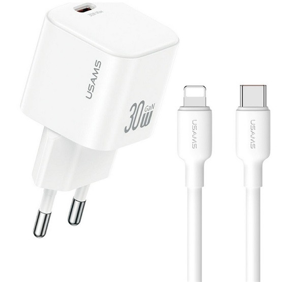 USAMS JO hálózati töltő Type-C aljzat (30W, PD gyorstöltő + lightning kábel) FEHÉR