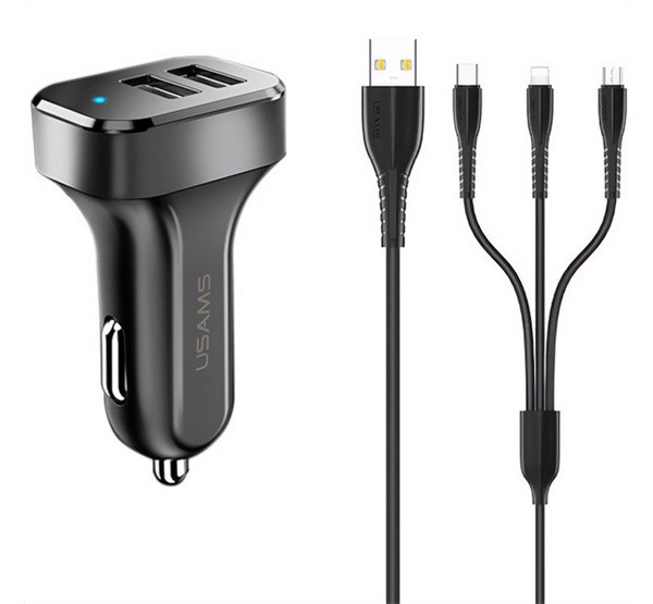 USAMS KING TU C13 autós töltő 2 USB aljzat (10W, LED jelzés + lightning/microUSB/Type-C kábel) FEKETE