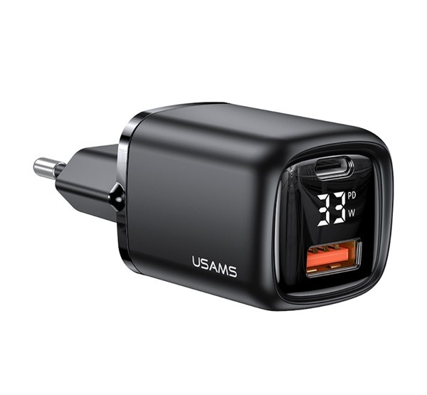 USAMS T46 hálózati töltő USB+Type-C aljzat (33W, PD gyorstöltő 3.0, LED kijelző) FEKETE