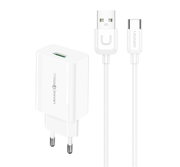 USAMS T48 hálózati töltő USB aljzat (18W, gyorstöltő 3.0 + Type-C kábel) FEHÉR