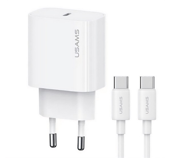 USAMS T65 hálózati töltő Type-C aljzat (20W, PD gyorstöltő + Type-C kábel) FEHÉR