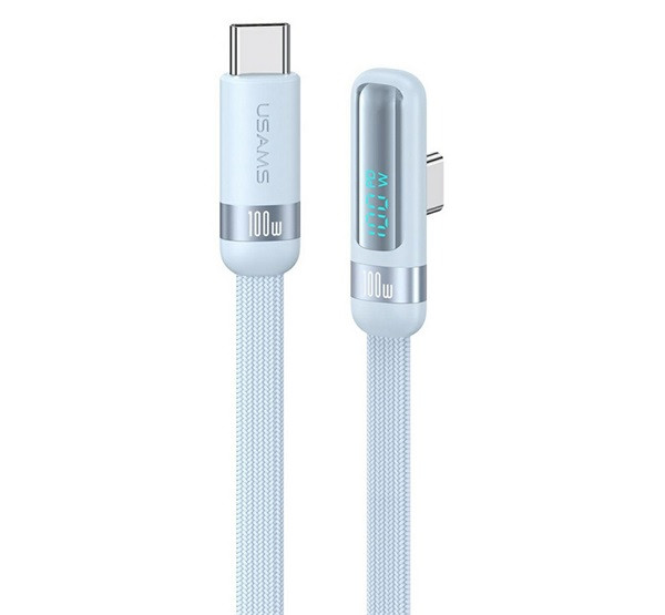 USAMS US-SJ653 adatkábel (Type-C - Type-C, 100W, gyorstöltő, 90 fokos, cipőfűző, LED kijelző, 120cm) VILÁGOSKÉK