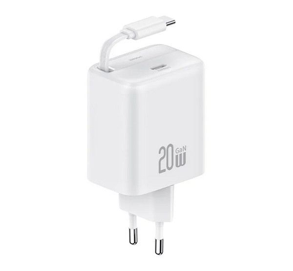 USAMS YC hálózati töltő Type-C aljzat (20W, PD gyorstöltő, GaN + fix, csévélhető Type-C kábel) FEHÉR
