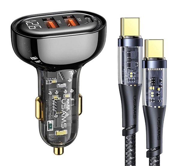 USAMS autós töltő 2 USB+Type-C aljzat (80W, gyorstöltő + Type-C kábel) FEKETE