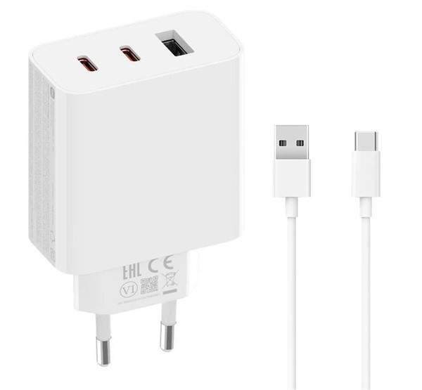 XIAOMI hálózati töltő USB+2 Type-C aljzat (67W, GaN, gyorstöltő + Type-C kábel) FEHÉR