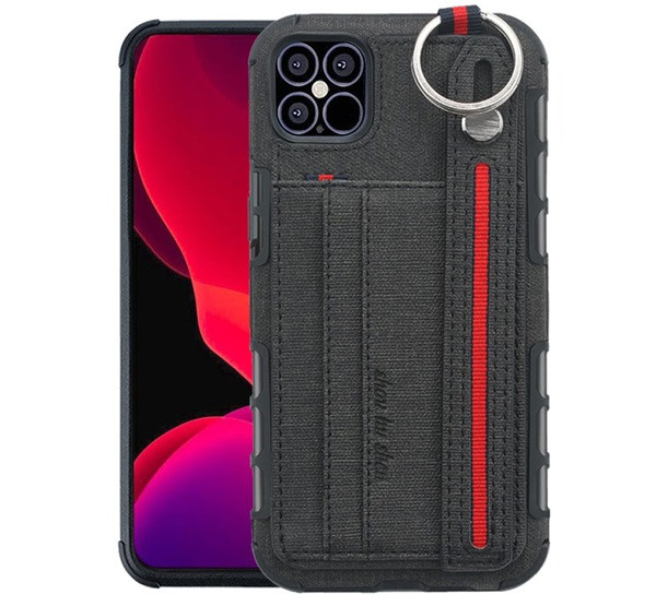Szilikon telefonvédő (ütésállóság, asztali tartó, kártyazseb, textil hátlap + kézpánt) FEKETE
