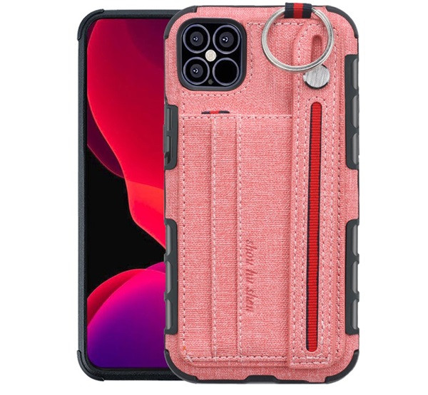 Szilikon telefonvédő (ütésállóság, asztali tartó, kártyazseb, textil hátlap + kézpánt) RÓZSASZÍN