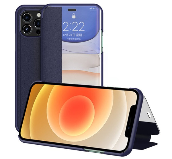 Tok álló, bőr hatású (FLIP, oldalra nyíló, asztali tartó, ablakos) SÖTÉTKÉK