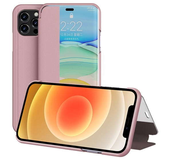 Tok álló, bőr hatású (FLIP, oldalra nyíló, asztali tartó, ablakos) RÓZSASZÍN