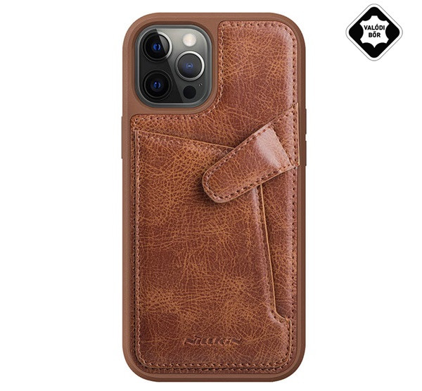NILLKIN AOGE műanyag telefonvédő (valódi bőr hátlap, mikrofiber plüss belső, kártyazseb) BARNA