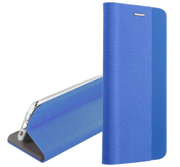 Tok álló, bőr hatású (FLIP, oldalra nyíló, asztali tartó, textil minta) VILÁGOSKÉK
