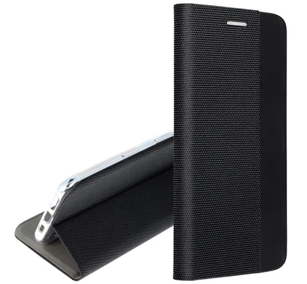 Tok álló, bőr hatású (FLIP, oldalra nyíló, asztali tartó, textil minta) FEKETE
