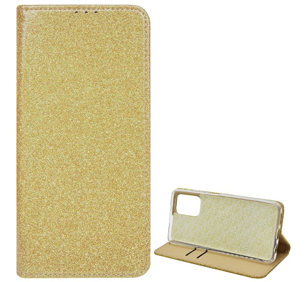 Tok álló, bőr hatású (FLIP, szilikon belső, oldalra nyíló, asztali tartó, kártyazseb, csillogó) ARANY
