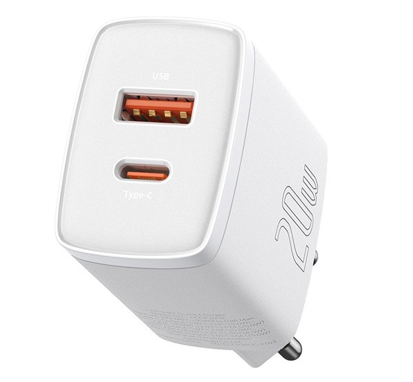 BASEUS COMPACT hálózati töltő USB+Type-C aljzat (20W, PD gyorstöltő 3.0) FEHÉR