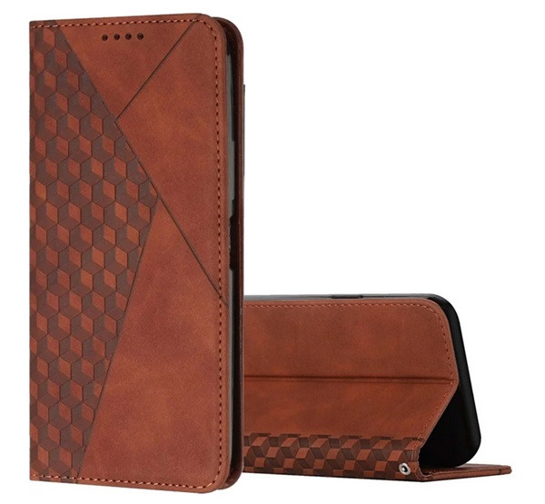 Tok álló, bőr hatású (FLIP, oldalra nyíló, asztali tartó, 3D rombusz, prémium) SÖTÉTBARNA