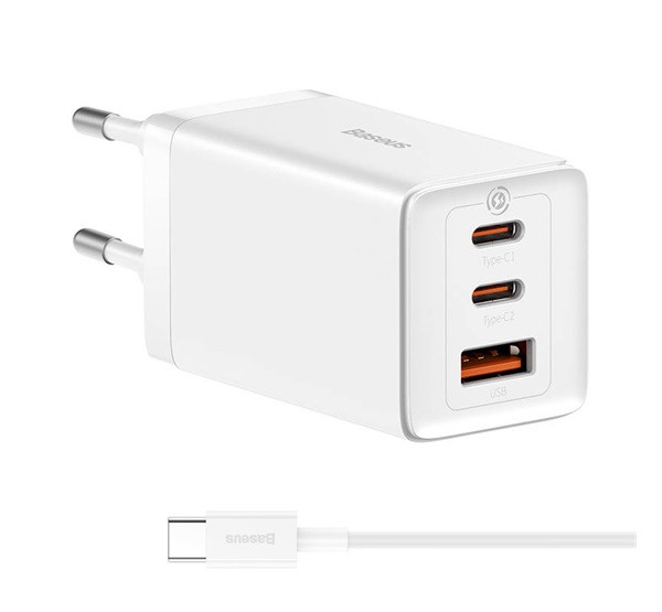 BASEUS hálózati töltő USB+2 Type-C aljzat (65W, PD gyorstöltő + Type-C kábel) FEHÉR