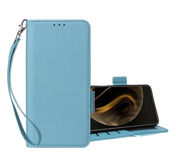Tok álló, bőr hatású (FLIP, oldalra nyíló, asztali tartó, prémium + kézpánt) VILÁGOSKÉK