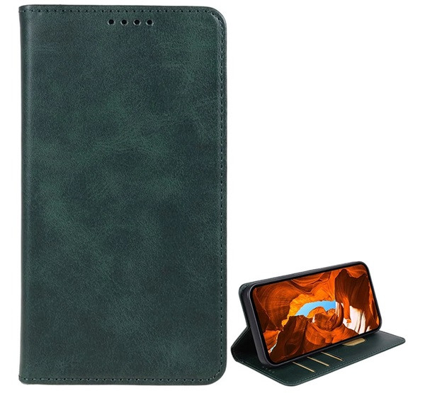 Tok álló, bőr hatású (FLIP, oldalra nyíló, asztali tartó, koptatott bőr minta, prémium) SÖTÉTZÖLD
