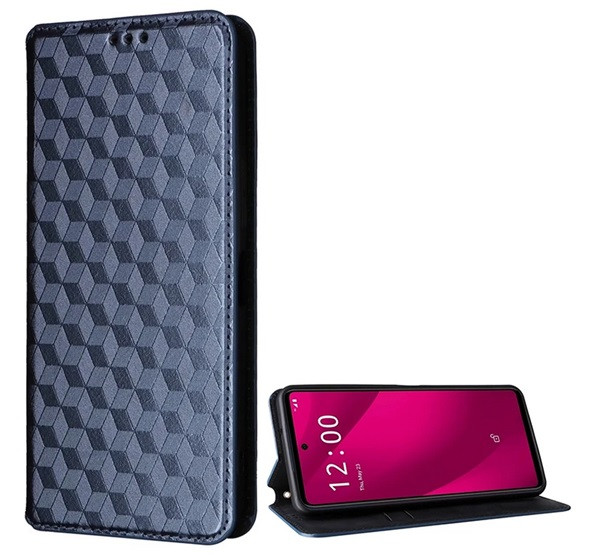 Tok álló, bőr hatású (FLIP, oldalra nyíló, asztali tartó, teljes 3D rombusz, prémium) SÖTÉTKÉK