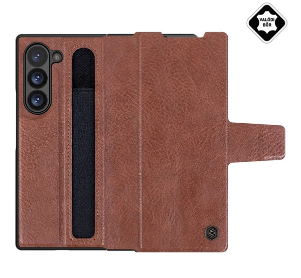 NILLKIN AOGE műanyag telefonvédő (valódi bőr hátlap, mikrofiber plüss belső, ceruza tartó) SÖTÉTBARNA