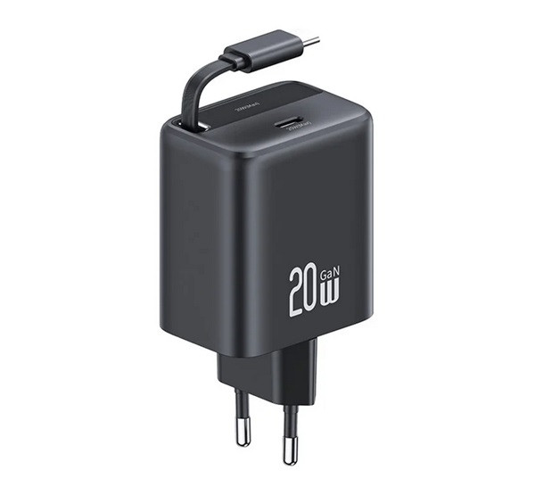USAMS YC hálózati töltő Type-C aljzat (20W, PD gyorstöltő, GaN + fix, csévélhető Type-C kábel) FEKETE