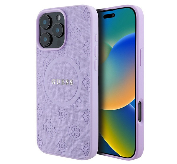 GUESS SAFFIANO PEONY CLASSIC LOGO szilikon telefonvédő (ütésállóság, bőr hatású hátlap, MagSafe) LILA