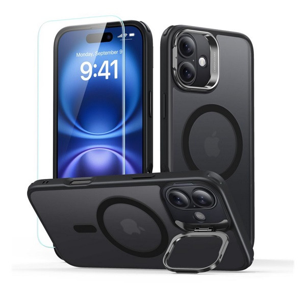 ESR CLASSIC HYBRID szilikon telefonvédő (ütésállóság, kitámasztó, MagSafe, matt + képernyővédő üveg) FEKETE
