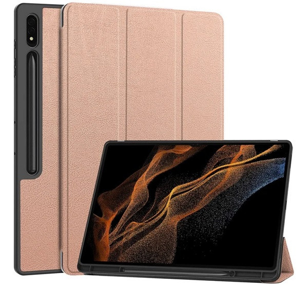 Tok álló, bőr hatású (aktív FLIP, oldalra nyíló, TRIFOLD, asztali tartó, ceruza tartó) ROZÉARANY